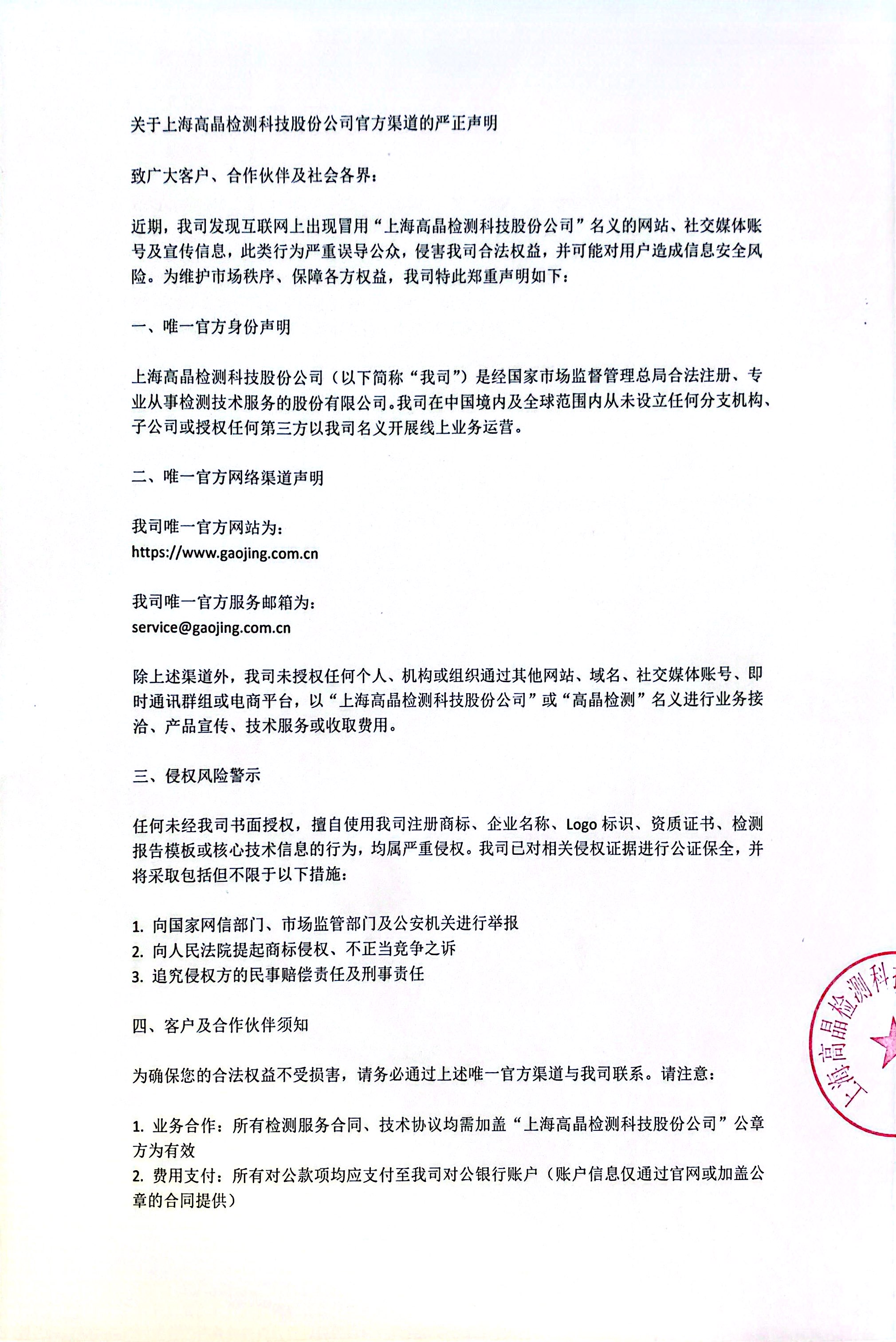 關于上海高晶檢測科技股份公司官方渠道的嚴正聲明